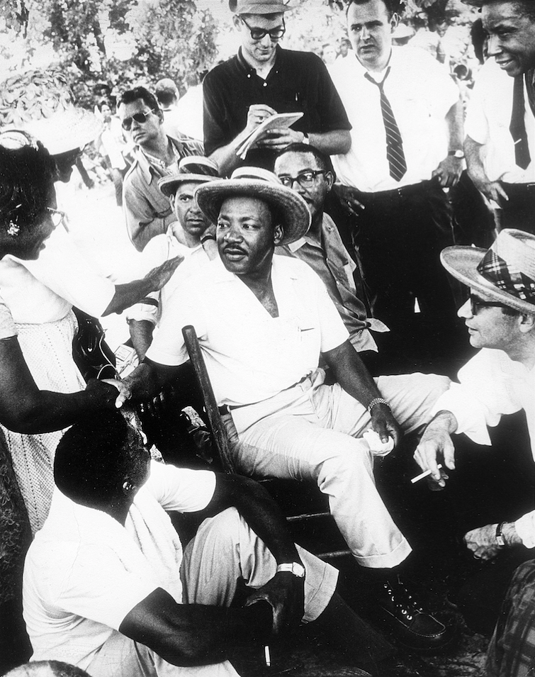 Martin Luther King, Jr in Straw Hat Sitting Down with Group of Men While Shaking Hands with Woman, 1960’s