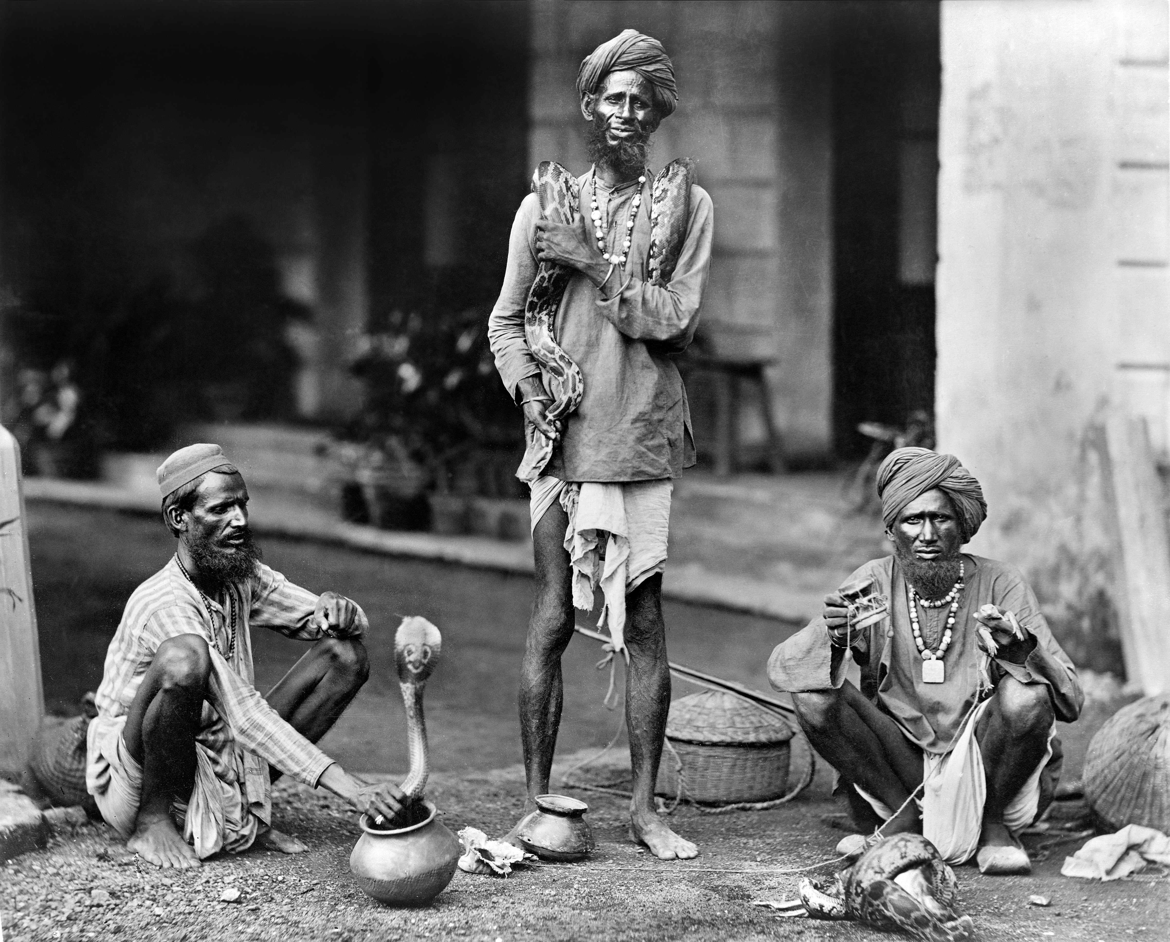 Three snake charmers, India, 1890