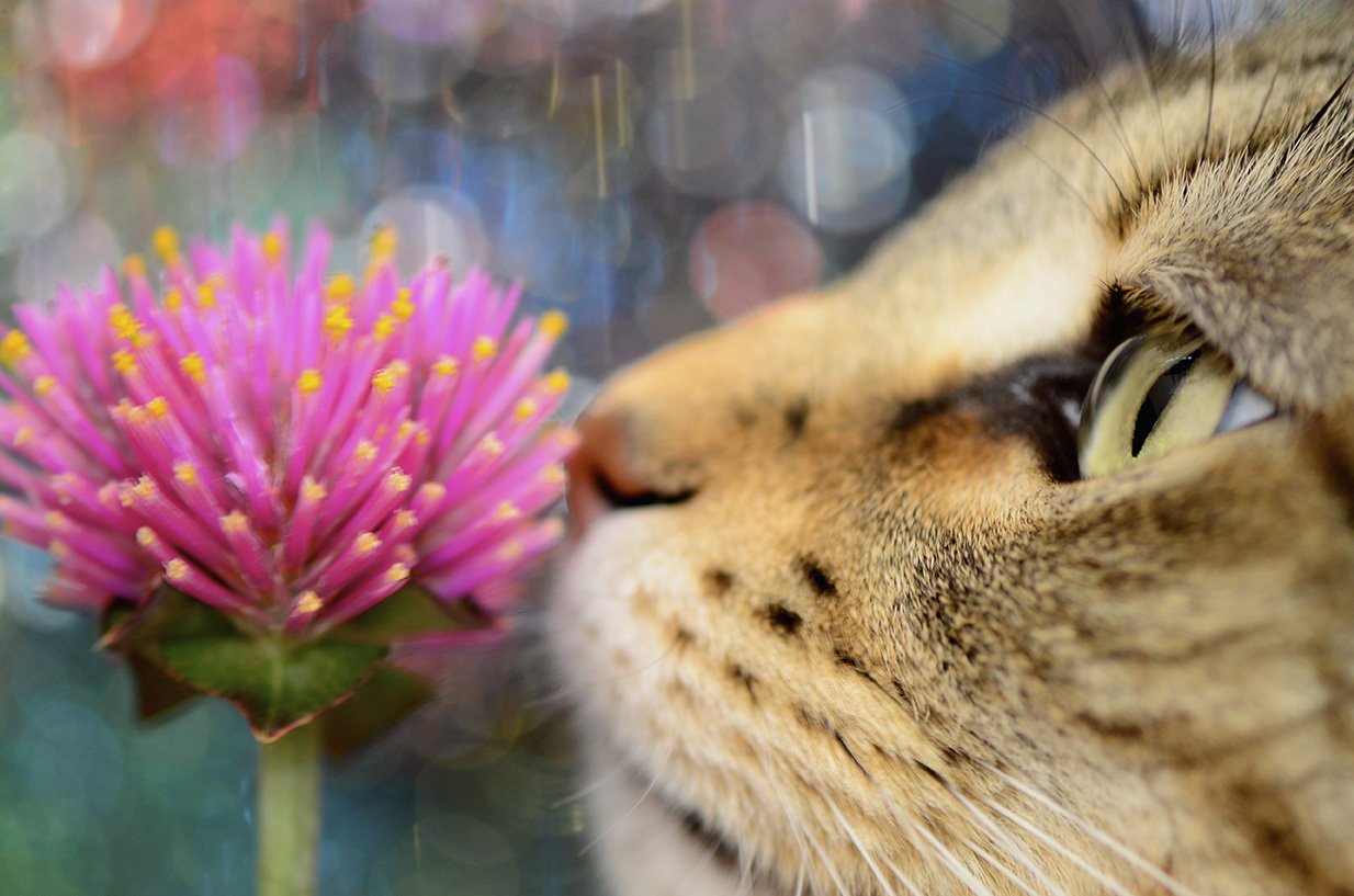 Cat Smelling Pink Flower, Close Up