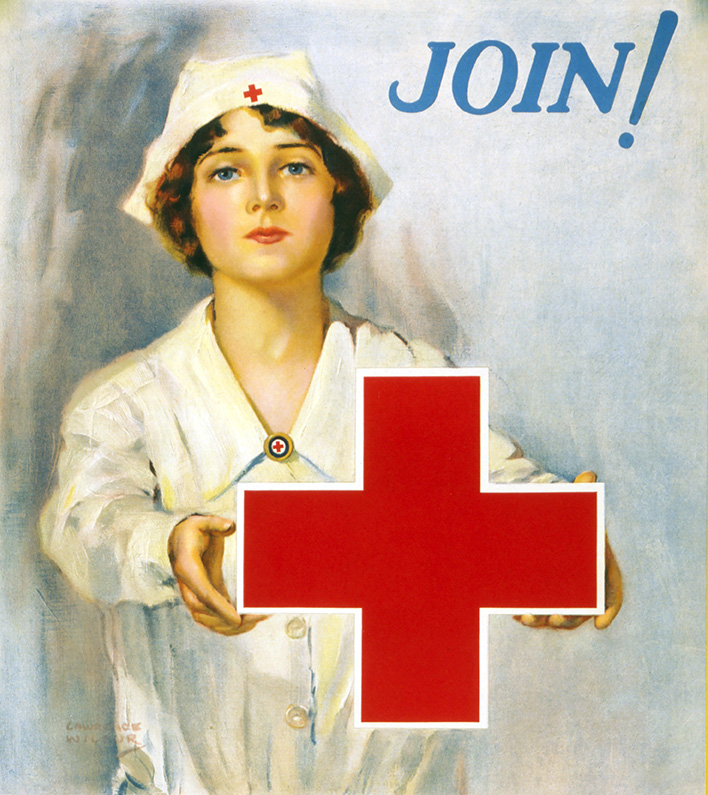 Red Cross Nurse Holding Red Cross, “Join! American Red Cross Serves Humanity”, Membership Drive Poster during World War I, by Lawrence Wilbur, USA, 1917
